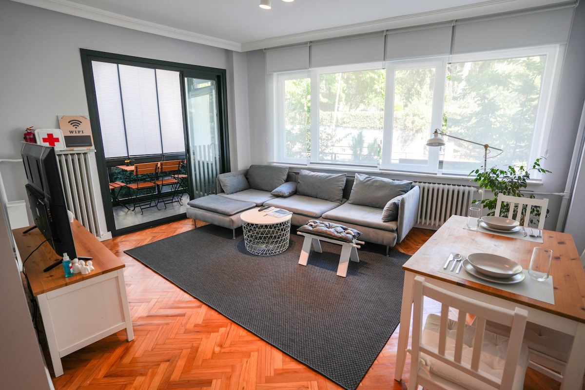 This unique apartment is in our modern boutique hotel in Ortaköy, Istanbul, just a 2-minute walk from Ortaköy Coast, the iconic Bosphorus Bridge, Ortaköy Mosque, and popular kumpir and waffle shops. It features a spacious bedroom, a living room, and a private backyard garden fully furnished for outdoor relaxation. With two air conditioners, a fully equipped kitchen, a washing machine, and a 40-inch TV, the luxurious and modern design ensures a comfortable stay for two guests.