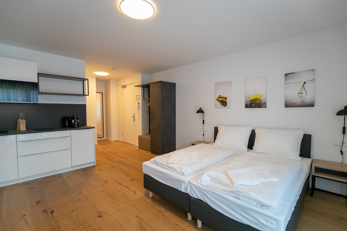 Liebevoll gestaltetes Apartment mit Boxspringbett, Küchenzeile, kleinem Duschbad mit Fenster und Infrarotheizung, privater Patio-Terrasse und eigenem Eingang in ruhiger Wohngegend. Die Bauweise entspricht einem kleinen Bungalow (28 qm). In der Umgebung gibt es kostenlose öffentliche Parkplätze, vor dem Studio befinden sich 2 E-Ladestationen. Direkte Parklage, etwa 180 m zum Ufer. Das Studio wird nach jedem Besuch gründlich gereinigt, die Oberfächen desinfiziert. Check in/out per Schlüsselbox.