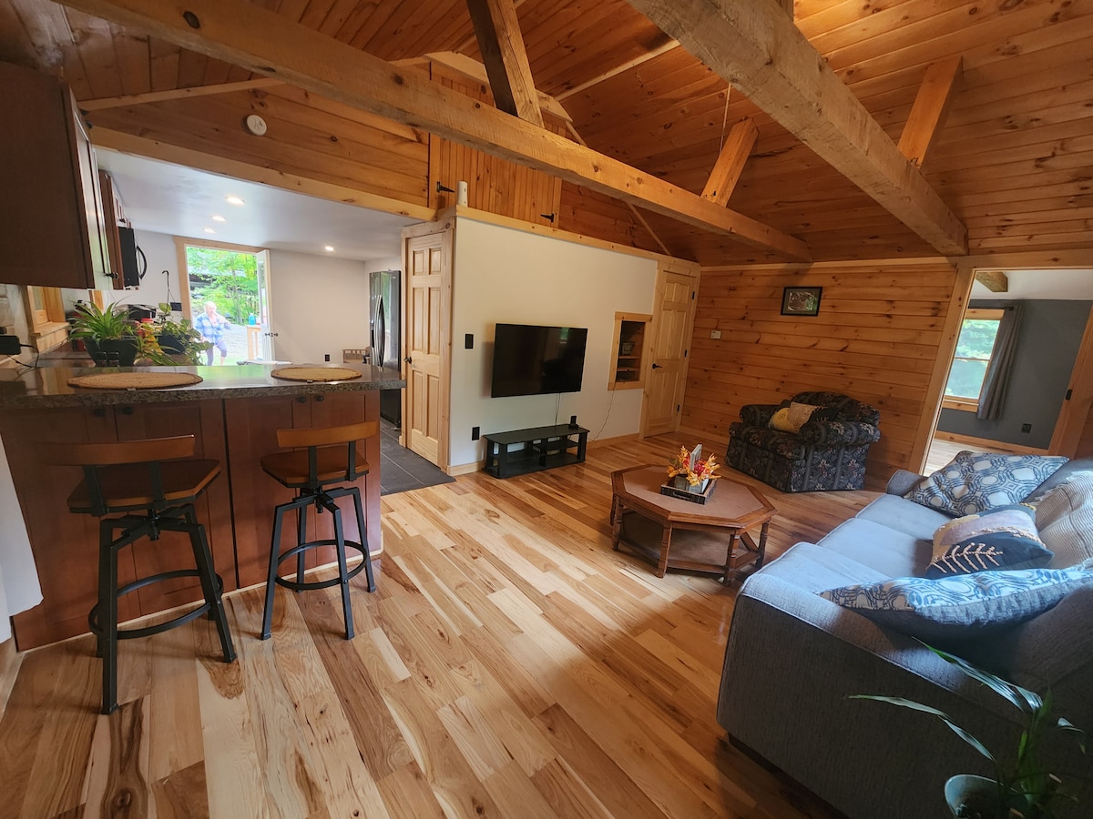 This rustic north country cabin offers 2 bedrooms and 1 bath for up to 4 guests. It has been renovated with comfortable beds and pillows, new appliances, a toasty pellet stove, a beautiful 75" TV with soundbar and subwoofer for movie nights, ample parking. It's located 9 minutes south of downtown Littleton and 11 minutes north of Cannon Mountain. Whether you're visiting for winter sports, leaf watching, mountaineering, or Polly's Pancakes, we're close to the action.