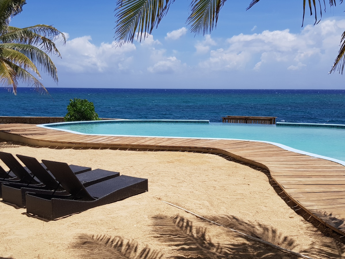 Kick back and relax in this calm, stylish 2 bedroom Condo on the ocean with an infinity pool. 5 minutes east of Ocho Rios, within walking distance to an oceanfront restaurant, local jerk centre, bar and grocery store. We can host up to four guests. As we have many couples traveling we offer a discounted base rate for two guests and then each additional guest comes with an additional fee up to a maximum of four. For two guests we will often close the second bedroom unless otherwise requested