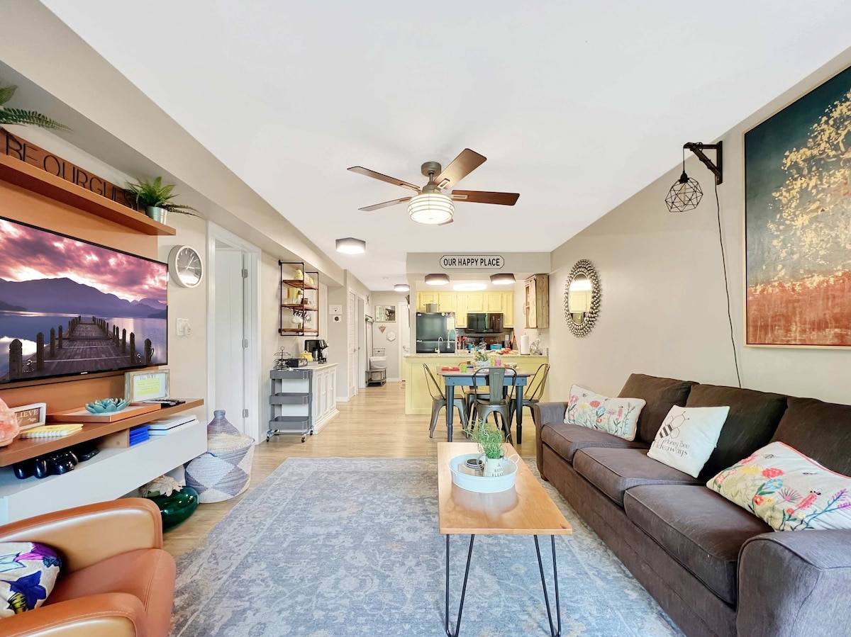 Completely remodeled Large King Suite with new wood floors and furniture, HVAC, cabinets, appliances, paint! King size bed! Two flights of 5 STEPS up to UNIT. Excellent community Nice kitchen with cabinets, microwave, garbage disposal, stove top! Nice sofa to watch TV on without having to lie in bed to watch TV! Everything you need for a comfortable stay either long or short term! WASHER DRYER COMBO UNIT FOR A RARE LAUNDRY OPTION IN A KING SIZED UNIT Two flights of 5 STEPS up to UNIT