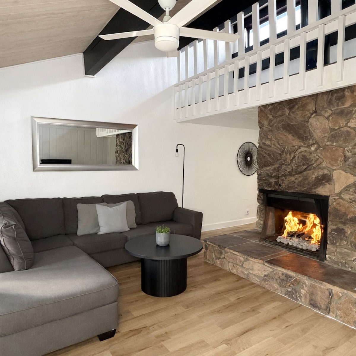 Welcome to The Den, a 1960s cabin reimagined by LBL Design Co. This moody, romantic retreat blends almond-blasted ceilings, warm wood tones, and modern finishes — complete with a private hot tub under the pines. Perfectly centered in the San Bernardino Mountains, it’s your base for snow days, trail adventures, and slow, cozy nights by the fire. Sip wine on the deck, roast s’mores under the stars, and unwind beside the glowing fireplace on our plush velvet sofa.