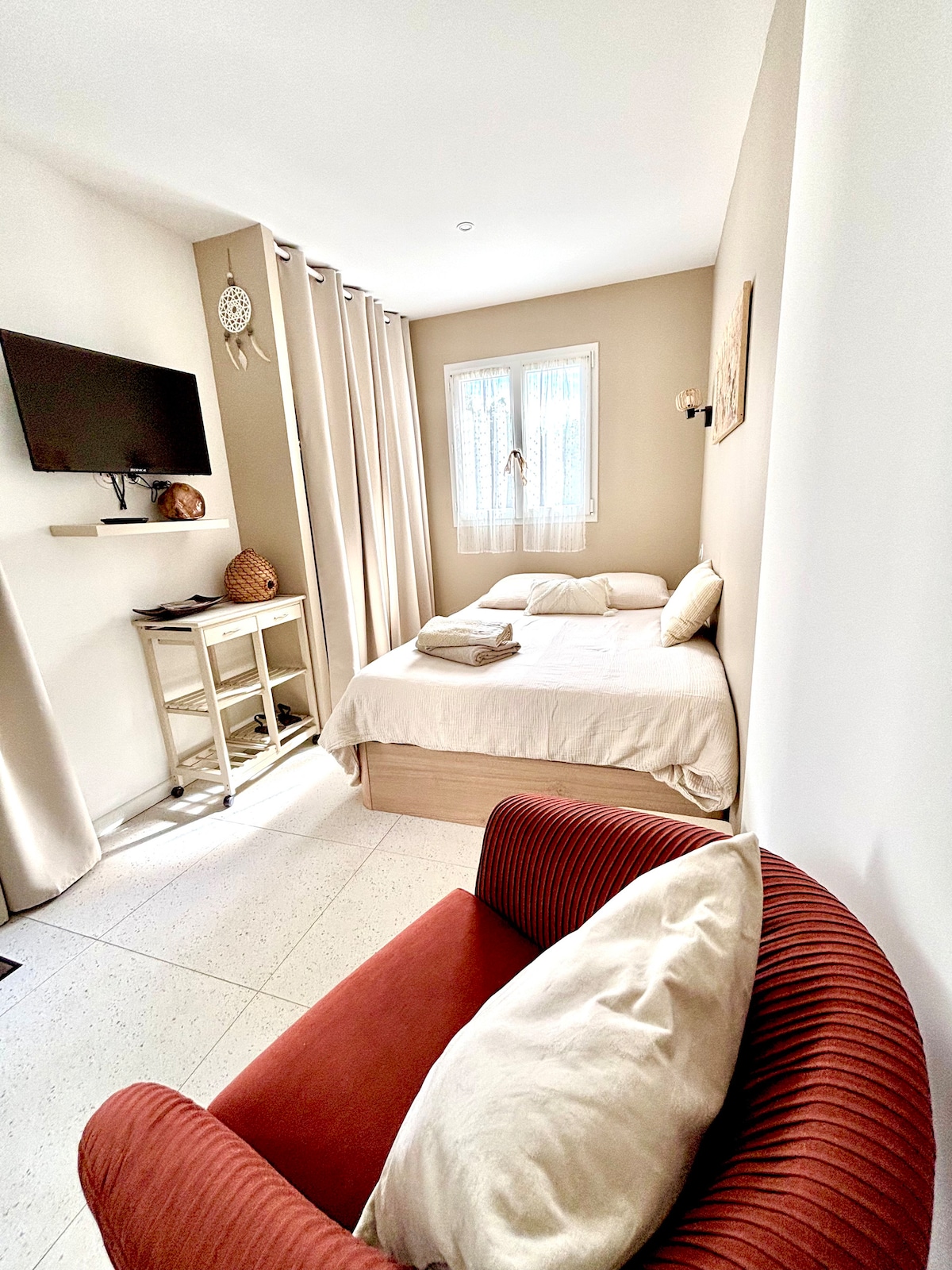 Au coeur de Lanas, charmant petit village ardéchois, venez découvrir notre studio très "cocoon" et atypique, à proximité de l'Ardèche. Le logement est fonctionnel et idéal pour 2 personnes. 😍 De plain pied, il a une entrée indépendante sur une cour fermée (utile si vous avez des vélos)... L'appartement se compose d'un coin cuisine/repas très bien équipé et une chambre séparée, avec 1 lit confort (160×200cm) + 1 sdb/wc. Il est ouvert sur une belle terrasse couverte... pour le farniente🌞😎
