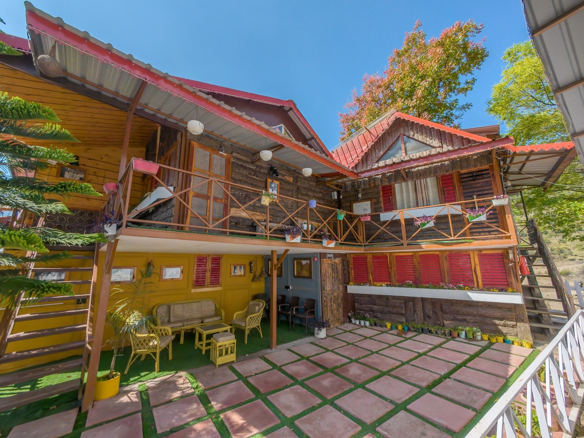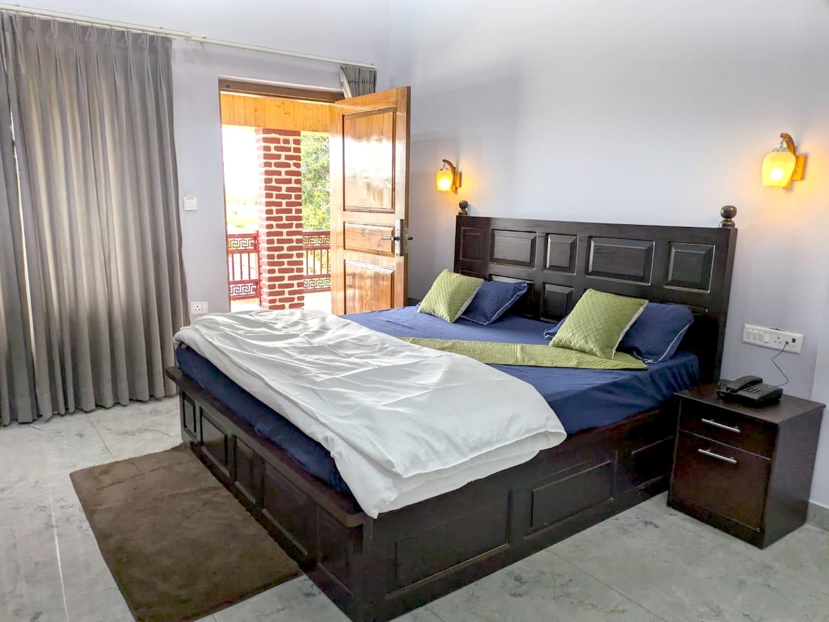 Comfortable private rooms with attached washroom in a boutique hotel, with workspace, huge garden and outdoor sitting, power backup and WiFi, perfect for those looking to relax or work remotely, accessible by road, with all major tourist attractions nearby only. Enjoy spectacular views of the serene lush green valleys of the Garhwal range. Magnificent sunset view, just 50 meters from resort. Entire place is guarded by oak trees, situated at 1700 meters above sea level.