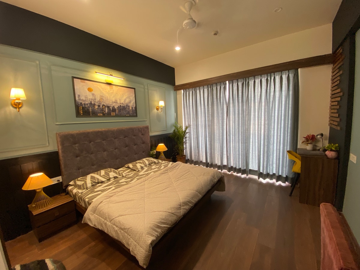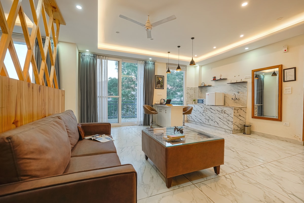A cozy 2BHK home with a view straight out of a movie—watch sunsets, rainbows, and the Himalayas from your balcony overlooking a 9-hole golf course. Perfect for couples and families, it features a designated workspace with ergonomic chairs, handpicked furniture, and art. The living room is made for Netflix nights with a sound system, high-speed WiFi, and a fully equipped kitchen for home-style comfort. 15 mins to Rajpur road.