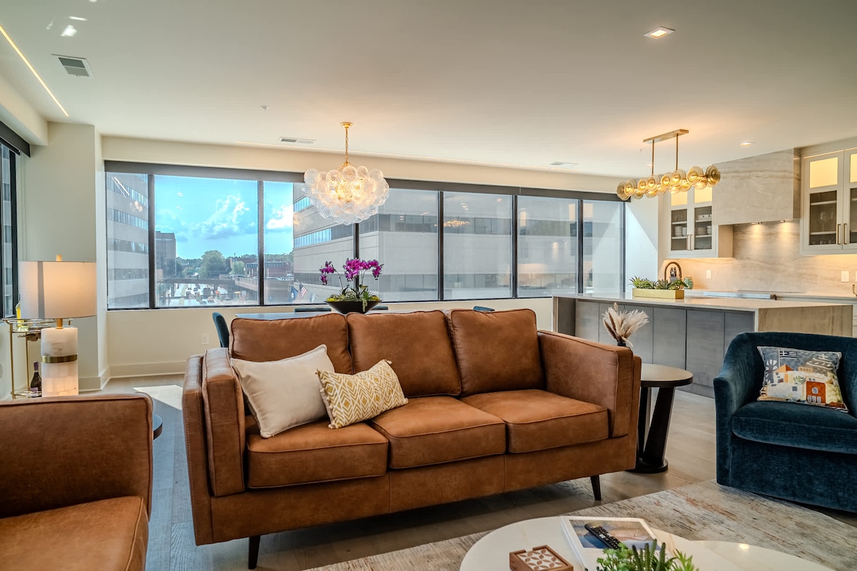 The Top Shelf is a space carefully crafted with amenities aplenty! Perched on top of the 90-year-old Pepper Bourbon Distillery, this condo is for the Lexington visitor who likes to be in the middle of the action. Soaring views, three balconies, and all the amenities to make your Bluegrass visit one of a kind. The Top Shelf is perfect for a discerning couple, an adventuring family, or for a group of fun-seekers. Large parties are not allowed. Maximum guests, per LFUCG code restrictions =10