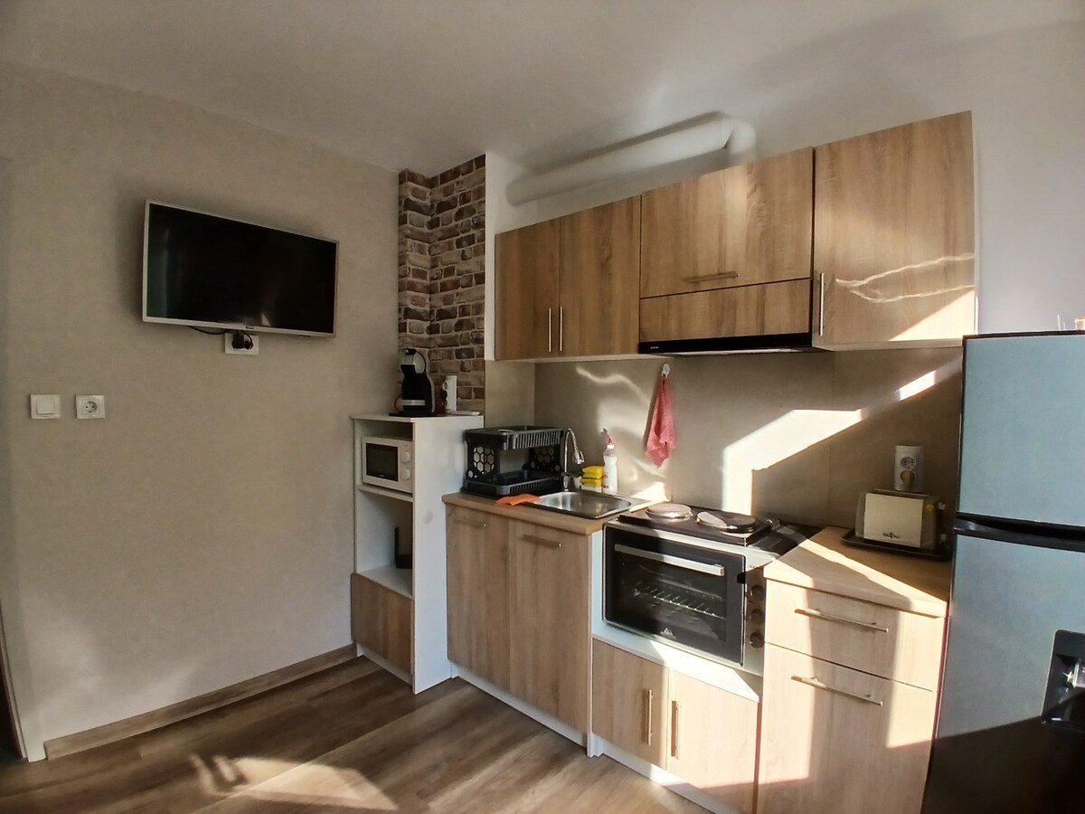 This apartment has two bedrooms, a spacious living room with air conditioning, fully equiped kitchen and a clean and comfortable bathroom. You as a guest will enjoy easy access to everything from this centrally located place. There are nice restaurants located nearby with great views. The beautiful center of the city is 10 minutes walk away, where you can find restaurant Happy, Hacienda etc. In addition within a walking distance in a minute, there is a modern bulgarian restaurant.