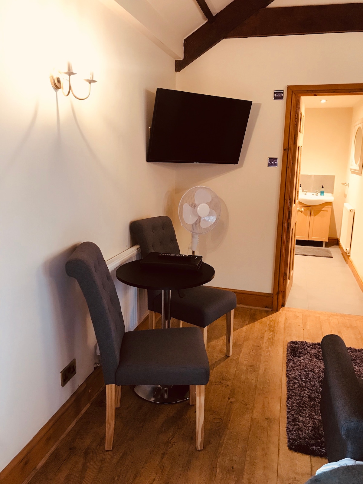A self-contained, ground floor, 1 bedroom modern guest suite. Featuring a king size bed, 43" smart tv and free WiFi. Fine Egyptian linen, fluffy towels, and bath robes ensure you wind down and relax. Luxurious ensuite with freestanding bath, wet room with power shower and heated towel rail. Separate breakfast dining area with 24hr tea / coffee making & a mini fridge.