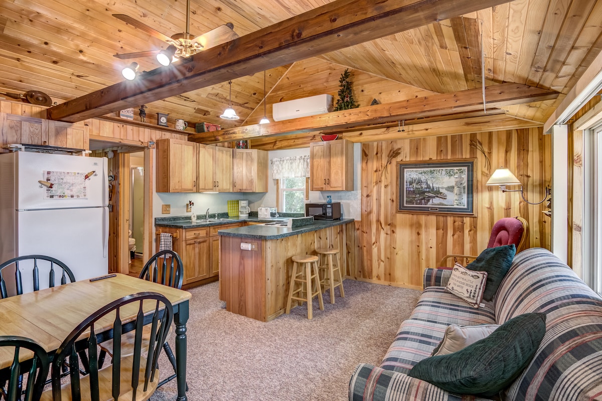 This is a quaint little cabin on the Flambeau River just outside of Ladysmith, WI (flambeau translastes to flaming torch) It is a clean space with rustic charm. It has a fully equipped kitchen, stove and fridge. A gas fireplace is the centerpiece of the living room. Snuggle up on the sofa or recliner, turn on the fireplace, and relax. There is one bedroom with a memory foam mattress. A loft with a sleeper couch. Free amenities, including cleaning. No pets and no smoking at any time please.