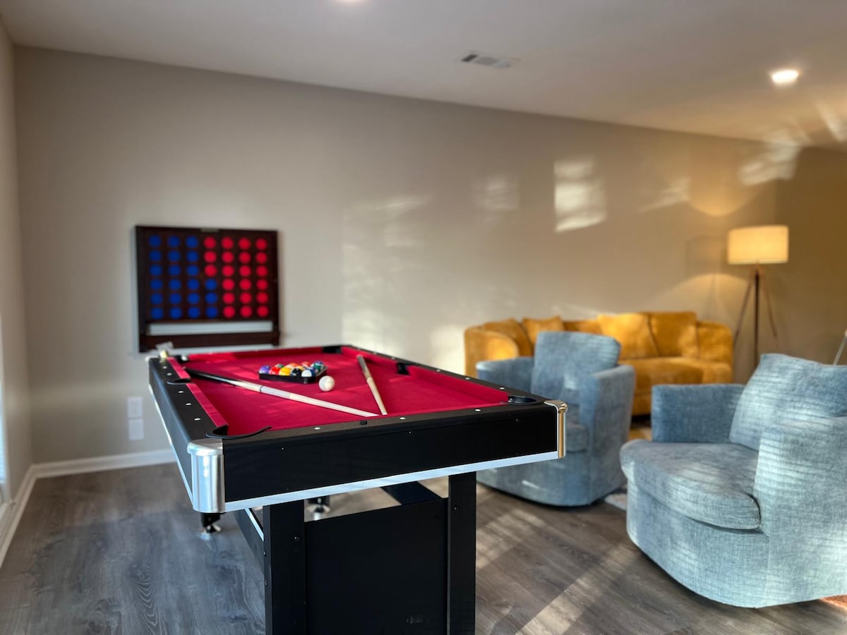 Property Overview: - Modern style home with a spacious and fun backyard. - Features three large bedrooms, large TVs in every room plus in the movie room, outdoor pool, and garage set up with pool table, PS5, and arcade games. Location: - Situated in a small, quiet, and safe neighborhood. - 12 minutes to Fort Moore's main gate. - 10 minutes to downtown Columbus. - 4 minutes to Mall. - 8 minutes to exit 10/12 outdoor shopping area.