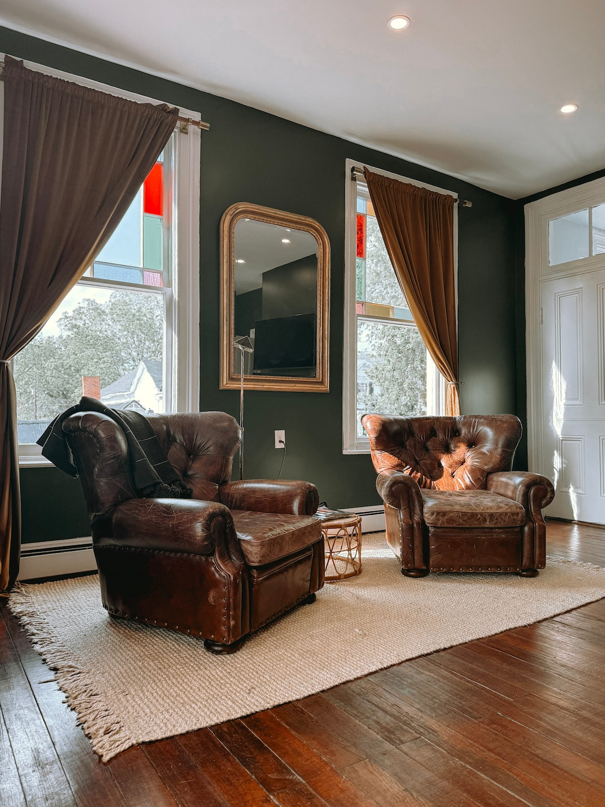 Reconnect in a boutique pied-a-terre nestled on Main Street in the heart of Abingdon’s Historic District with classic Art Deco Design. The Green Room was inspired by The Barter Theater. Your ground-level suite includes a well-equipped kitchenette/dining with sofa/trundle; walk-in shower with body spray & rain head; smart TV, antique electric fireplace with bar & phonograph, internet; bedroom with queen bed, beautiful fireplace, chaise lounge and glamorous dressing table.