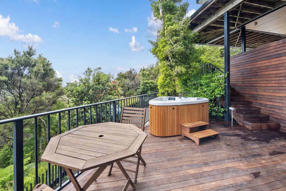 Spacious and comfortable studio apartment with a queen bed and ensuite bathroom. Relax in the private hot tub after a day exploring the Bay of Islands. Eat either indoors or on the private deck. Stay connected with free wifi and a Smart TV. The apartment is connected parallel to a larger house but is not below the house. Off street parking is available for 1 car. Only 3 minutes drive down the hill to Paihia.