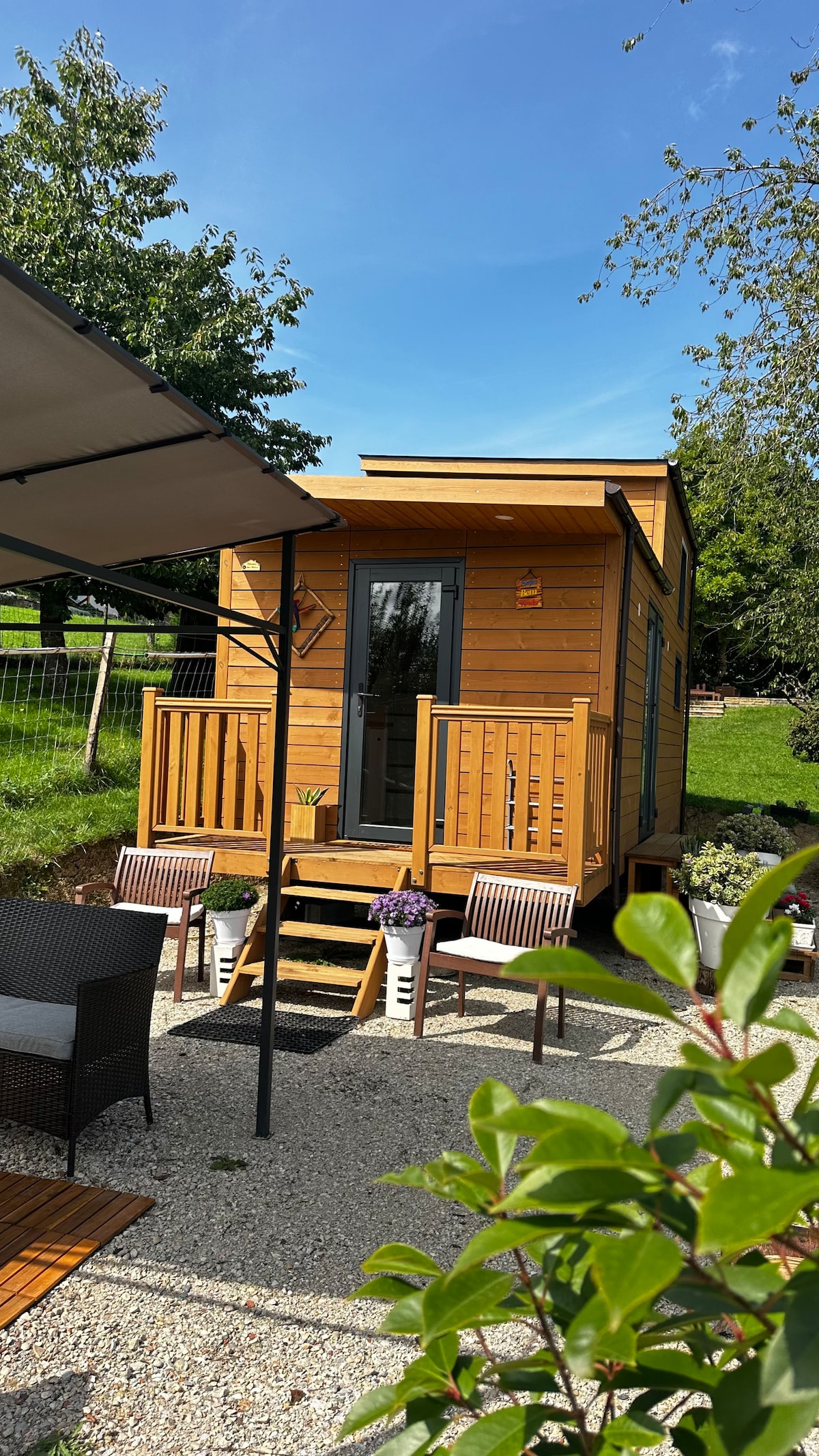 Profitez d'un espace accueillant en plein milieu de la nature. Ce logement atypique est un endroit formidable pour découvrir les activités environnantes. Cet espace peut accueillir jusqu' à 2 personnes en tout confort. Le logement est autonome et a une cuisine, salle de bains/toilettes, salle de séjour et une chambre. Il est niché au milieu d'un jardin magnifique avec une vue exceptionnelle, une vraie carte postale de Genève ! C'est un espace de 20 m2 avec un accès à une piscine privative.