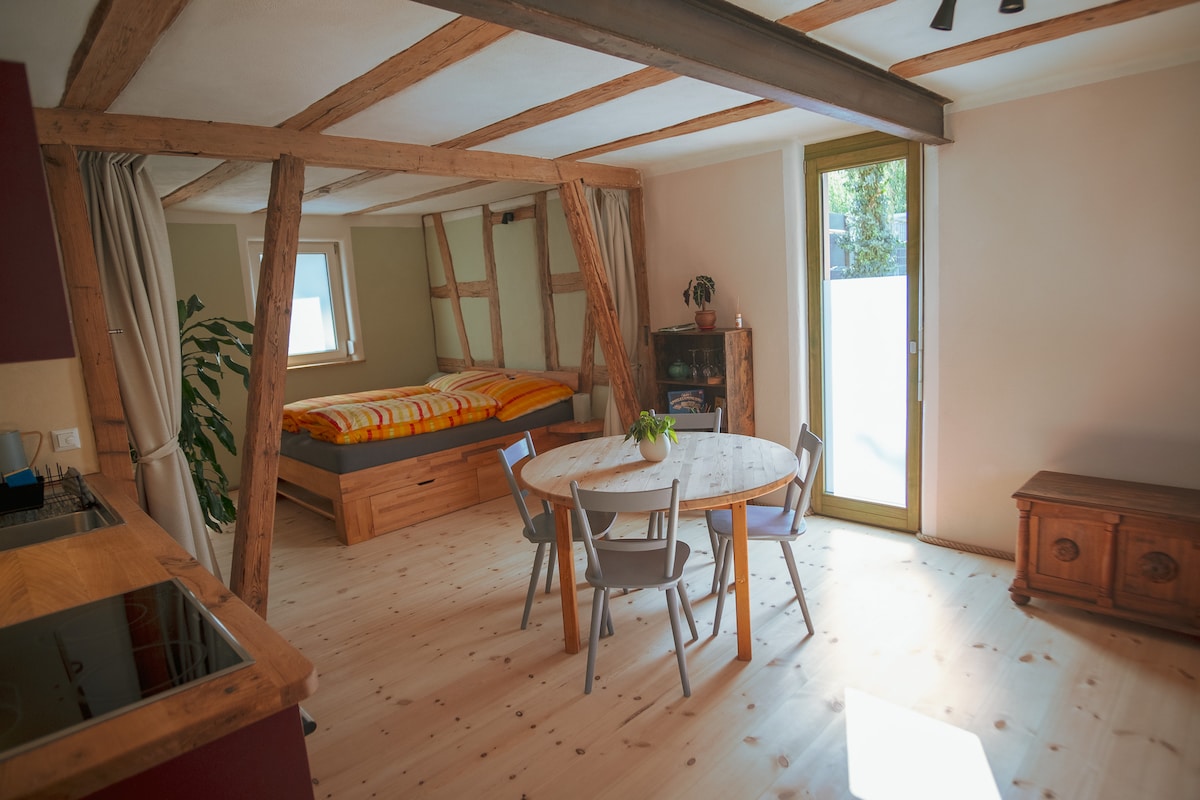 Wohnen in einzigartigem Ambiente: Fachwerkhaus im historischen Altstadtkern von Mahlberg. Teile des Hauses sind über 800 Jahre alt. Liebevoll restaurierte Wohnung mit antiken Möbeln. Weinumrankter Pavillon für das Frühstück in der Morgensonne. Sonnenliegen im Garten neben dem plätschernden Brunnen laden zum Entspannen ein. Weinkeller sowie großer Fitnesskeller mit separatem Zugang inklusive.