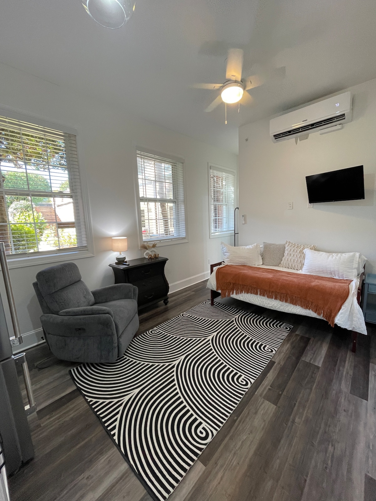 Visit TIEC (5mi) and NC foothills in a modern and cozy studio that sleeps up to 3 adults (or 2 adults and 2 children). The cottage features a recently renovated interior with queen bed, sleeper sofa, luxury linens, well equipped full size kitchen & laundry. Private fenced yard with sitting area, chiminea, and gas grill. Super fast, reliable wifi perfect for working or streaming your favorite shows. Centrally located, 5 miles to TIEC. Close to many wineries, hiking, and antique shops.