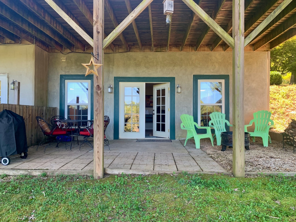 Embrace the peacefulness of the Carolina Foothills in this ground level unit. The private apartment features natural stone walls, exposed wood beams, touches of color, tasteful furnishings, high-end decor, and a first floor walkout. The view out of the large windows is trees and forest which contributes to a feeling of being utterly surrounded by nature. We are located in the foothills of the Blue Ridge Mountains--the peaks are close, but cannot be seen from the apartment. We live above, and are very quiet and low key--you may hear the occasional few footsteps or running water. Events and photo shoots are not allowed. Canebrake Road is a graveled country lane with curves. Our house is at the top of the lane on the left--the entrance to the driveway is manned by a cement sheep sporting the house number around his neck, and is officially .56 miles from the beginning of Canebrake Road. Fork left into our driveway. At night, aim for the streetlight atop our garage. The kitchenette has all you need for quick and easy meals. Fridge/freezer, microwave, toaster oven, hot plate, (if requested), coffee maker, full sink and complete dishware. The living area has a smart TV, books, cards, games, and magazines to keep you occupied in the evening hours. The studio is very spacious, and if you have a child, the sofa will suffice, or we can provide a small cot. The surrounding woods are peaceful and enveloping--conducive to long and restful sleeps. The calls of birds and katy-dids are just about all that you may hear.... Guests can park up in the top driveway area, where it is easier to maneuver, or directly in front of the apartment. The apartment is very private and secluded from the main house entrances. We are in the house attached, and can answer any questions you may have. We leave you to your independence, or will socialize if it is appropriate. You are the guests and the time here belongs to you.... The apt sits at the top of a small hill, reached by a curved gravel lane and is less than 5 minutes from both downtown Tryon and Columbus, home to a number of shops, restaurants, art galleries, movie theatre and more. The Tryon International Equestrian Center is just 15 minutes away and Harmon Field, an athletic complex, is located at the beginning of our road. In summer, our neighbor's homes are invisible. The location is private and serene. A car is mandatory. We have a nice walking circuit, right out the front door, which takes you through the woods. Harmon Field is a 2 minute walk down the lane, with multiple sports amenities and the Pacolet River to walk along.