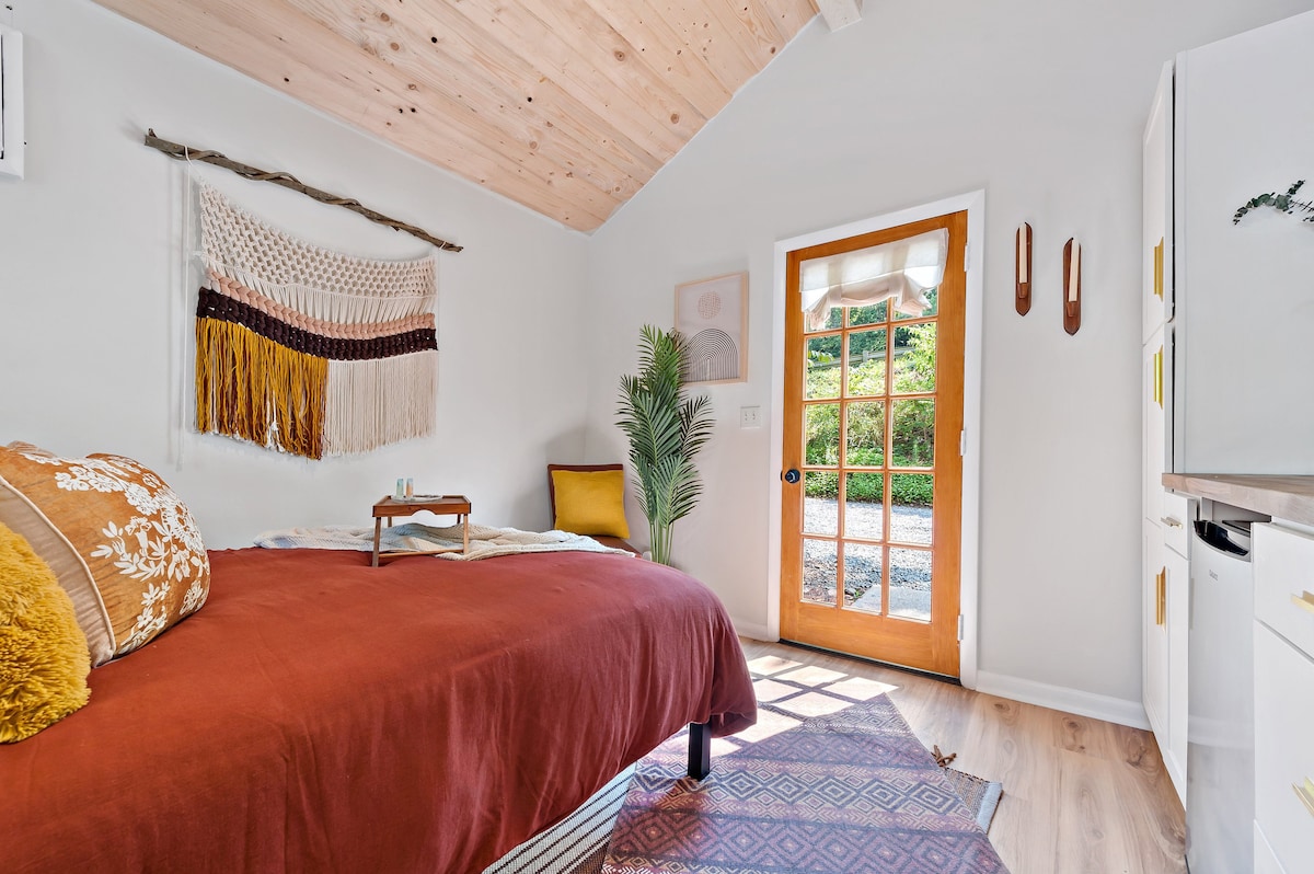 Adorable stand alone studio-tiny guesthouse perfect for couples or solo traveler. Private entrance equipped with a keypad smart lock. Use keypad for no-contact self check-in and to lock/unlock the door as you come and go. The tiny house is equipped with a refrigerator, 4 in 1 combination microwave, coffee maker, WiFi, and smart TV. Bring your streaming device to watch your favorite content. Parking: 2 spots on gravel pad. Tryon Equestrian Center-10 miles away, 16 min drive. NO Cleaning fee.