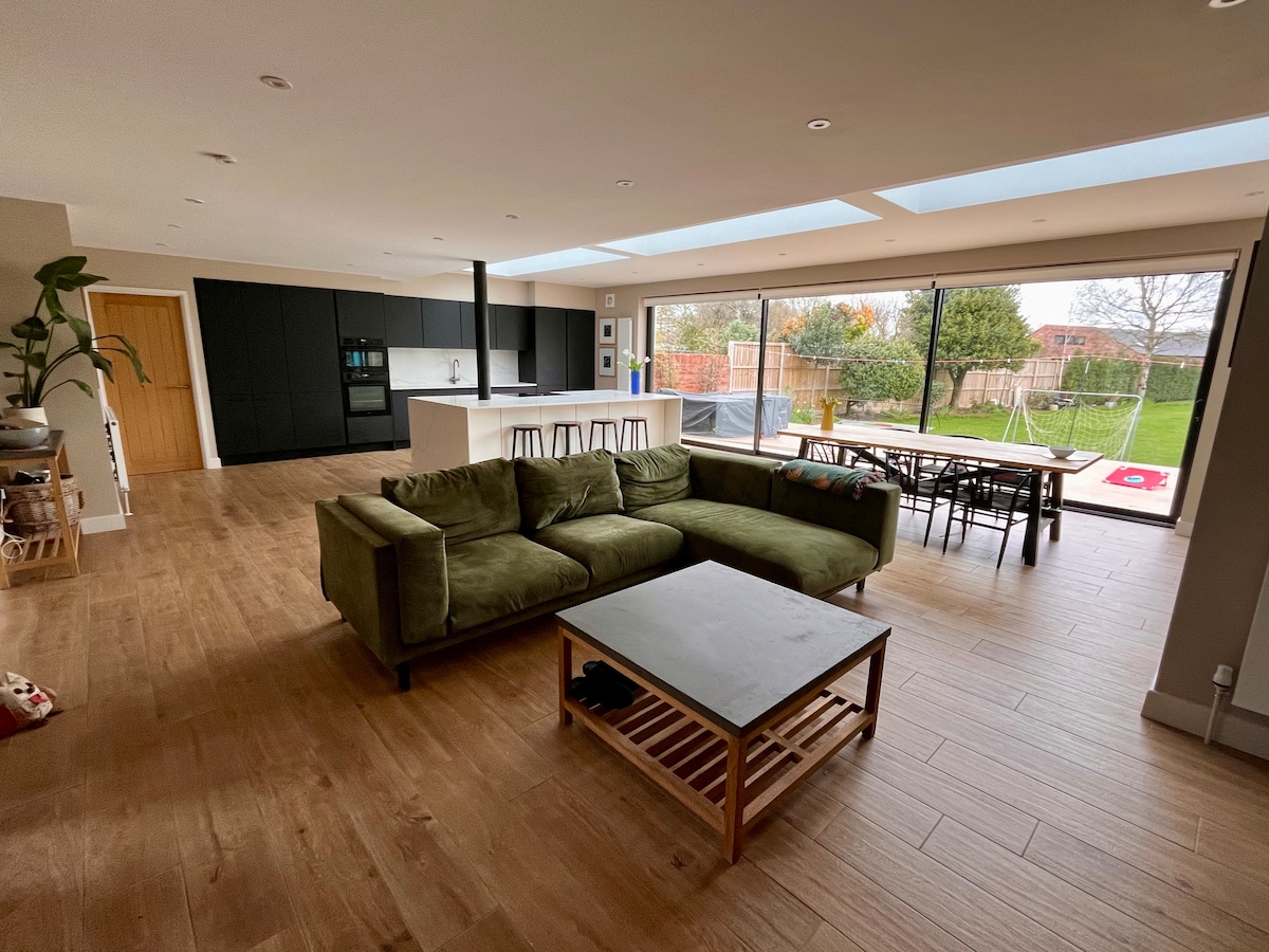 Openplan kitchen/dining/living with 75"TV. Bifold & patio doors.Large garden. Hot tub(surcharge), treehouse, sun loungers,parasol & seating 4 bedrooms(master with king bed & ensuite shower, double room with double bed, double room with king size bed (downstairs), room with 1 single & 1 trundle) Bathroom with bath and shower plus a downstairs toilet. 2nd living room with log burner. Crosstrainer & bike Walking dist to Stamford 10 min drive to supermarket 2 min drive to A1, 5 min drive to station