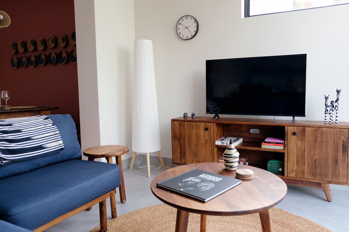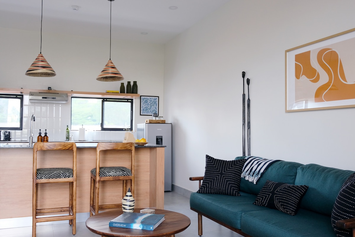 This peaceful 1-bedroom apartment is located 3km from Kigali Convention Center, a perfect spot for attending conferences, work trips, digital nomads, and tourism. The location gives easy access to Kigali’s shops and restaurants. The neighborhood is safe, walkable, and is home to ambassadors, NGOs, and the golf course. This unique spot has been furnished completely by local artisans. It includes high-speed WiFi, a washing machine, a fully equipped kitchen, and a private garden.