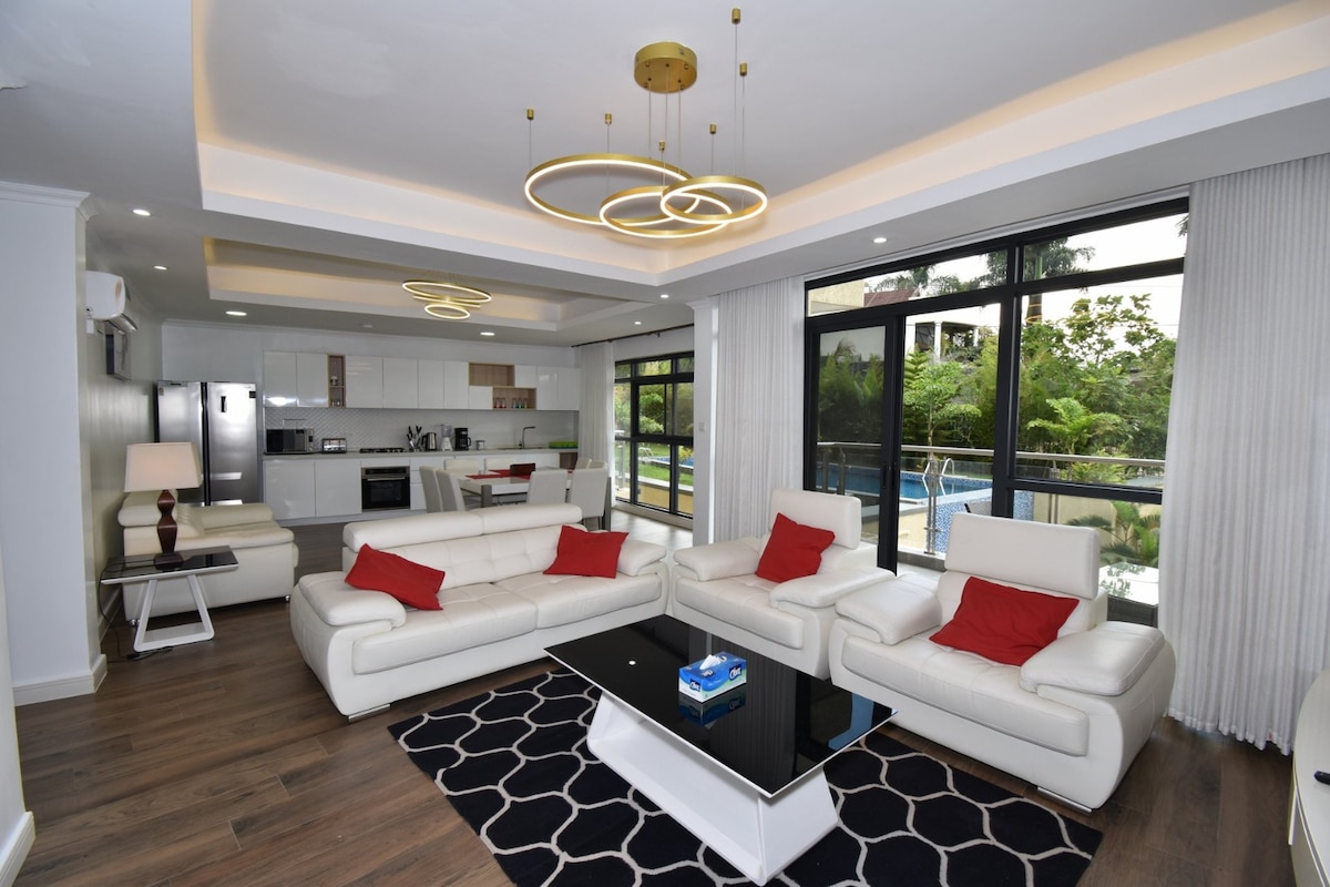 Discover the meaning of luxury at an exclusive Kigali address. Enjoy this new luxury apartment & pool, steps from Kigali's 18 hole golf course. Featuring 3 air conditioned rooms. 5 star appliances, exquisite modern furnishings, comfortable memory foam mattresses in ensuite rooms, this home exudes tasteful sophistication throughout. Located in Kigali's premiere neighbourhood of embassies, HNWI, NGO's etc. It is also conveniently located close to Kigali airport, restaurants and the city centre.