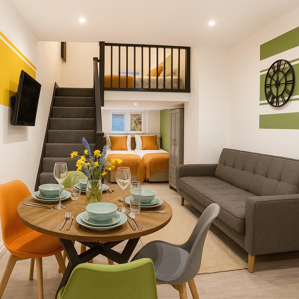 Welcome to Station Location! At the end of a quite bridal path, this property is a studio apartment that annexes our house. It contains a large super kingsize double bed or 3ft twin beds. It has a sofa, table and chairs, tv and plenty of storage in a large wardrobe. With an ensuite shower room and a kitchenette with all the essentials including a dishwasher. Parking available and pets are welcome!