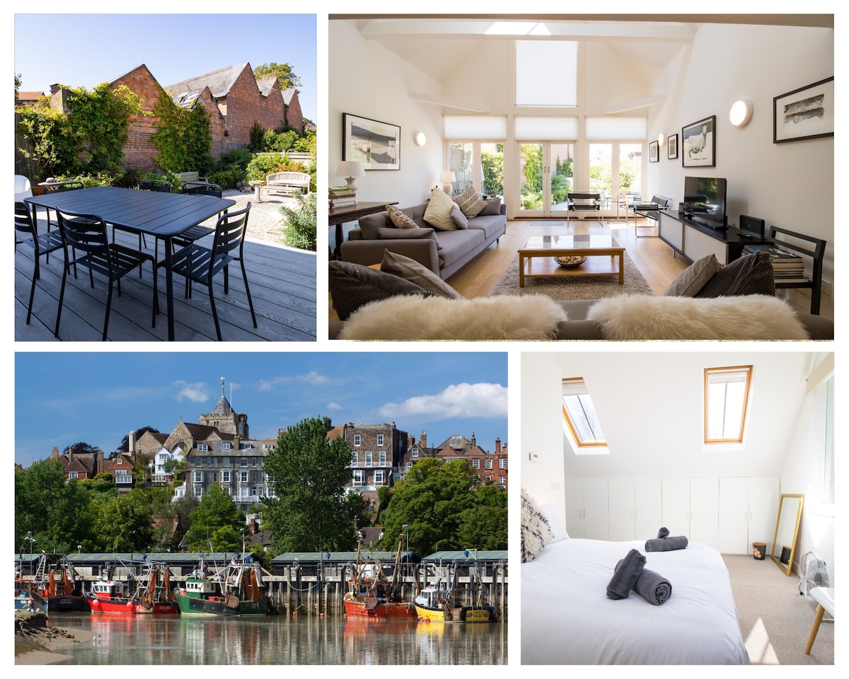 Sensational Conversion Featured in Grand Designs This old St.John Ambulance Station has been recently converted into a stunning, beautiful four-bedroom home, earning it features in Grand Designs Magazine, Deezen and winner of Architects Journal's Retrofit Award plus shortlist for the World Architecture Awards. The ideal place for hosting a holiday with both friends and family (and dogs!). Located within the old town walls of Rye and just a few minutes walk from the train station. Rye High Street is just a minute's walk up cobbled Conduit Hill. The space The home offers exceptional space with a large open plan living, dining and kitchen area. A double sided wood burner in the centre of the living area is fully functional and guests are welcome to enjoy this feature. Also on the ground floor is a shower room and one double bedroom - suitable for wheelchair use. As you continue upstairs you arrive at the second double bedroom and the main bathroom. Just past these is a twin room with single beds that can both be pulled out in to doubles. The master bedroom located at the far end of the property features an en-suite shower, super king sized bed and a picturesque view over part of Rye. The front doors can be both opened to allow for wheelchair access. Pets are allowed but confirm with ask us before you book. We recommend booking for up to 8 adults or 6 adults and 4 children. There is a fire pit and outdoor seating in the outside area.