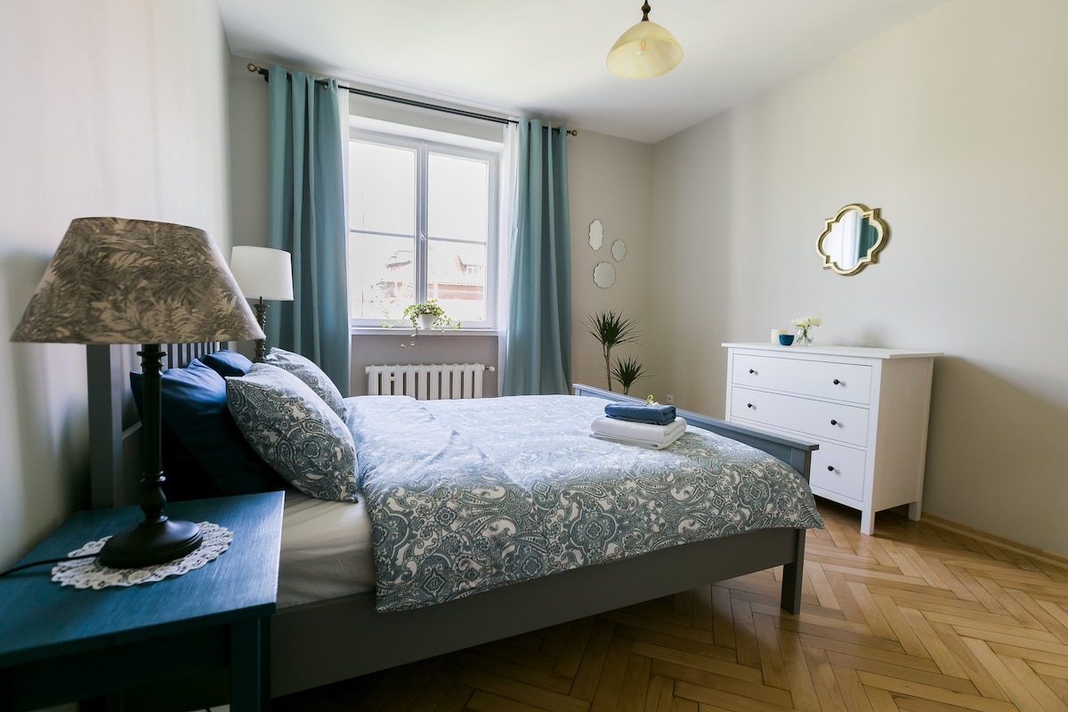 Centrally located classic vintage design apartment situated on the second floor of a historic tenement house with street and courtyard view, living room, fully equipped kitchen, dining space, large private bathroom, two quiet bedrooms, each furnished with a comfortable double bed. Air conditioning, heating, Netflix, WiFi, washer dryer and other amenities provided for a short term or long term stay in Krakow.