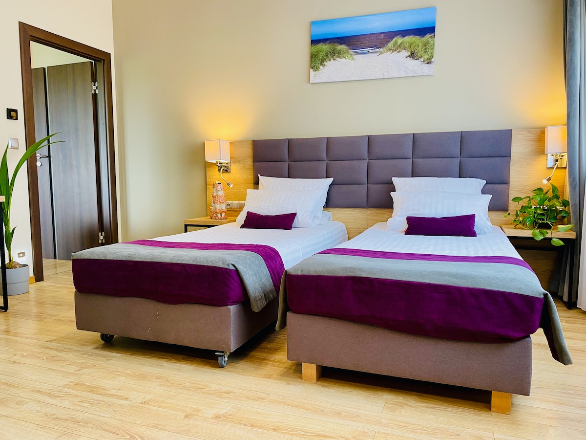 Immerse yourself in luxury and comfort in our 2-bedroom apartment with a living room and kitchenette. It's the perfect place for families, couples or friends looking to create unforgettable memories. Our bedrooms ensure a comfortable night's sleep, while the living room encourages quality time together In the apartment, you'll find a fully equipped kitchenette. After a busy day full of experiences, unwind in one of the two elegant bathrooms, where a comfortable bathtub and shower await you