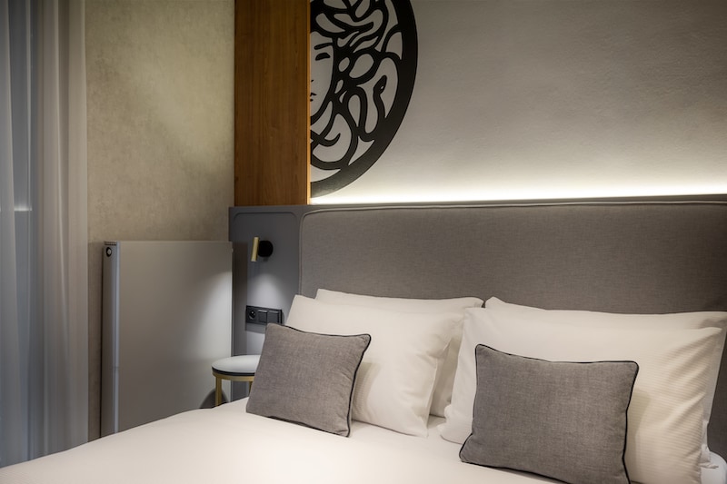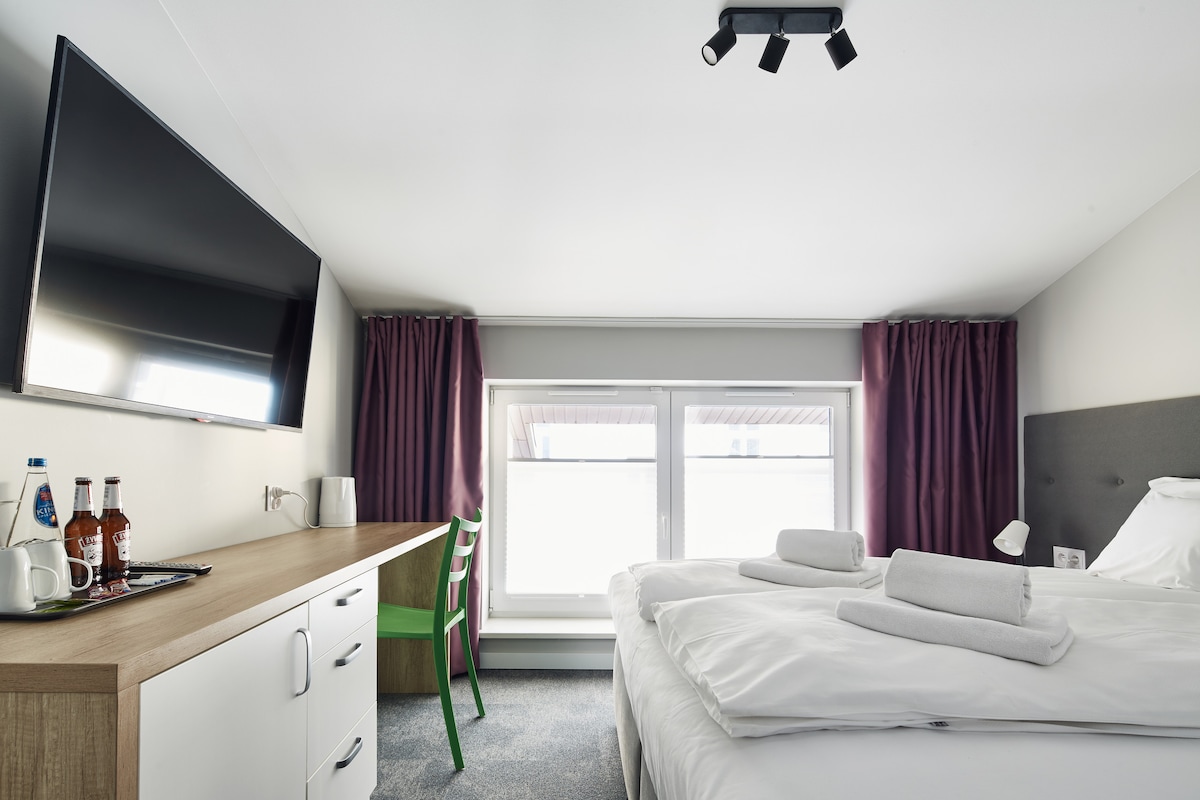 Welcome to our cozy hotel room designed with comfort and relaxation in mind. The room features a comfortable double bed or two single beds, with bedside tables on both sides equipped with lighting, perfect for reading or relaxing before sleep. Our helpful staff is available 24/7. On the ground floor, you'll find a restaurant where you can indulge in exquisite Italian cuisine.