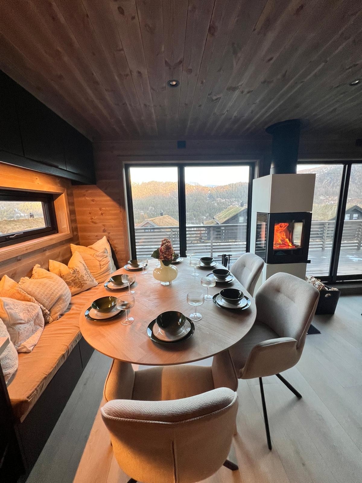 Moderne hytte fra 2021 med vinduer fra gulv til tak som åpner hytten mot en spektakulær utsikt over fjell og dal. På sommeren beiter sauene rundt hytten og er du heldig kommer det en hare hoppende. På vinteren er det ski inn/ut. Hytten har både varmepumpe og peis som gir god varme og kos. Den romslige loftstuen med TV, Lego og spill er perfekt for barna. Hytten passer perfekt for to familier. Er dere bare voksne anbefales maks 8 personer.