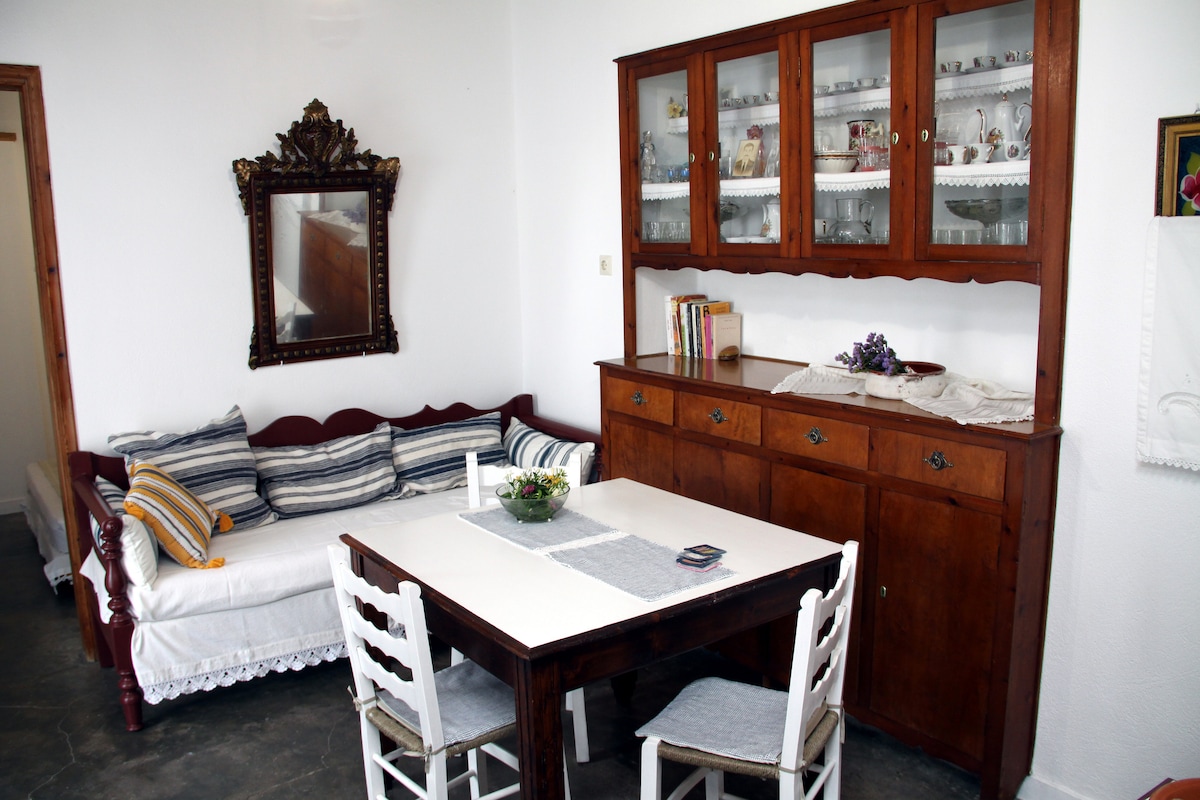 Anemosyrma is a traditional beach house in the magnificent island of Milos. Located in the small picturesque village of Agios Konstantinos, Anemosyrma (“anemos” greek word for wind & “syrma” for Melian boat house) is actually the upper floor of a traditional “syrma”, where people used to drag and store their boats to be protected from the sea. The apartment of 50m2 in an open space plan, has a balcony overlooking the sea and it preserves a modern country style featuring unique Cycladic elements.