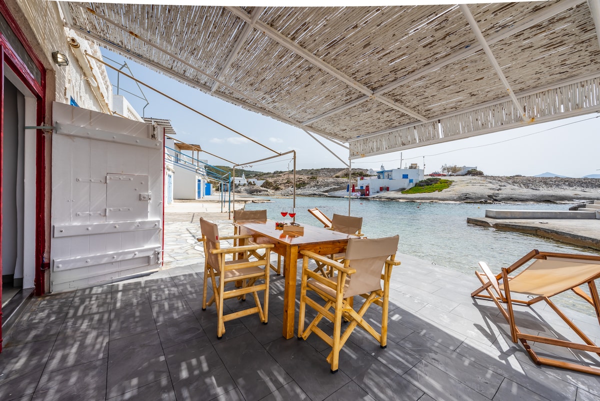 An open space beach house, of 60 s.m. for 6 pax with 1 double bed, 2 sofa beds and 2nd room with 2 single beds very stylish and comfortable. It is decorated with boho and cozy design styling combined with Cycladic culture. The house has direct access to a sea view veranda, with a big dining table. It is situated on a small bay, with similar moon white rocks as Sarakiniko that form a secluded cove in front of the house, together with Aqua house 1 & 3. Welcome basket with local products offered.