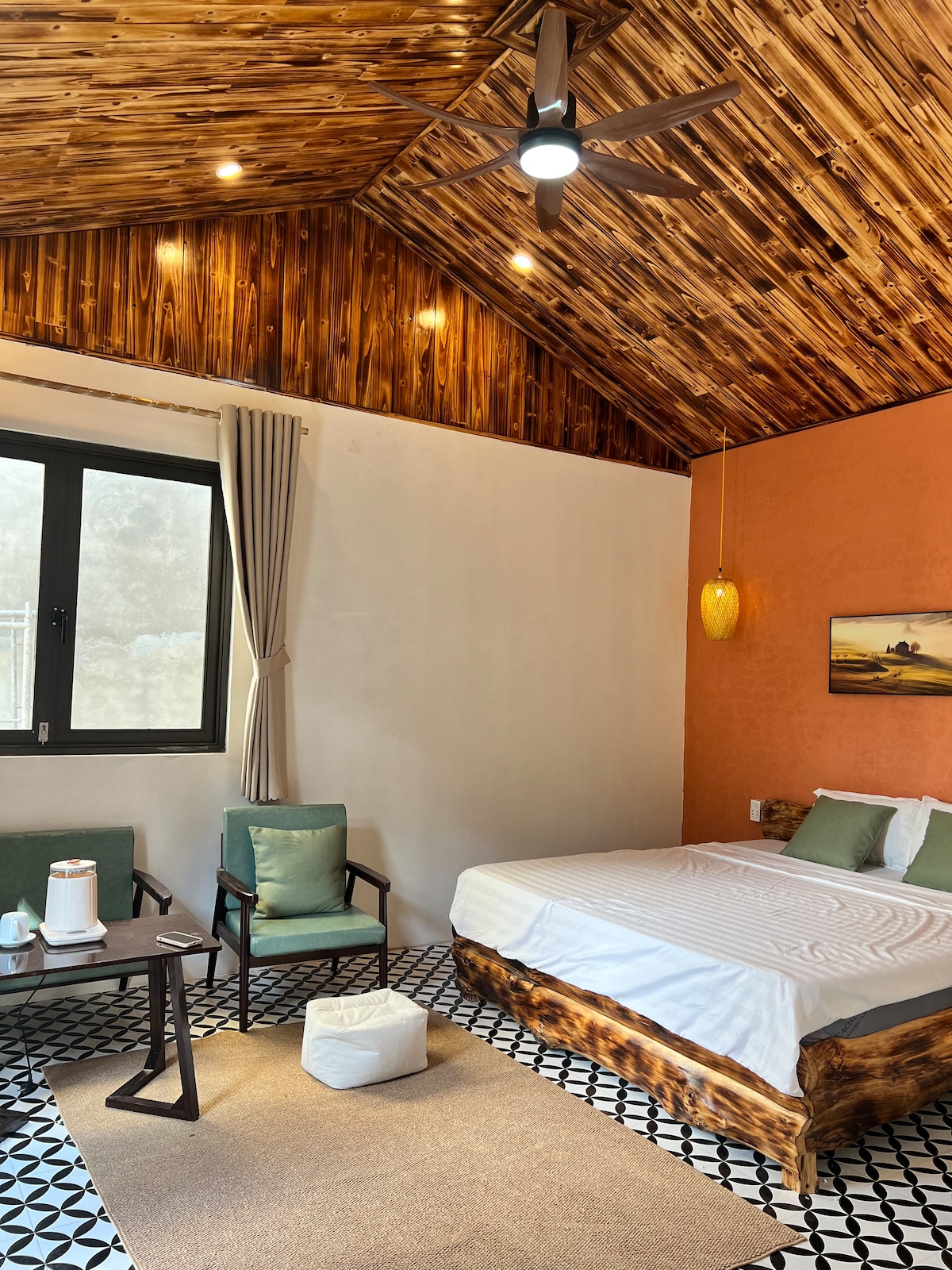 Bungalow gỗ gần gũi với thiên nhiên, đầy đủ các tiện ích: SmartTV, điều hoà hai chiều, nước nóng, minibar,… Khu sân chung rất rộng rãi, view đẹp. Có nhà hàng trong khu với panorama view.