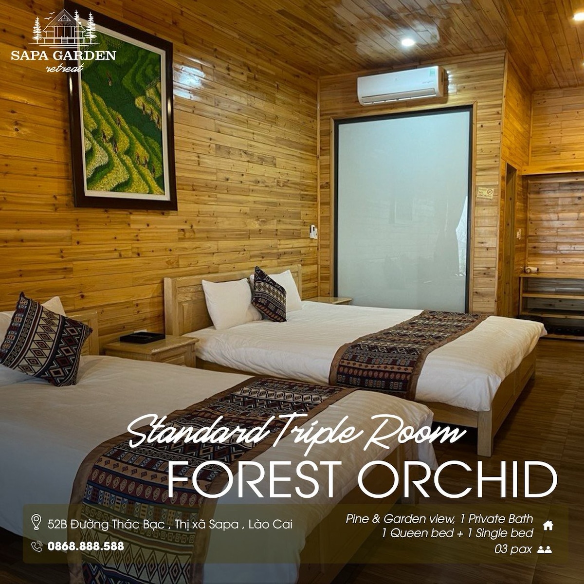 Welcome to the Panorama Room, where every sunrise paints the mountains in gold. Designed for two guests, this bright and elegant room offers sweeping panoramic views of Sapa’s hills, valleys, and misty skies — perfect for couples who love stunning scenery and peaceful mornings.