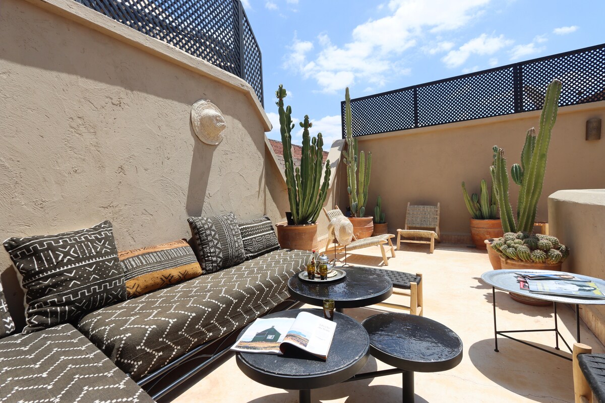 Kick back and relax in this calm, stylish space. This memorable riad is anything but ordinary with a chic design approach centred around a circular patio and staircase whose walls have been clad in a mesmerising arrangement of traditional red bricks. To balance this design feature the rest of the riad has been finished with off-white tadelakt and white bejemat tiles. The place feels both light and airy, and the beautiful rooftop terrace includes a pool to soothe the senses.