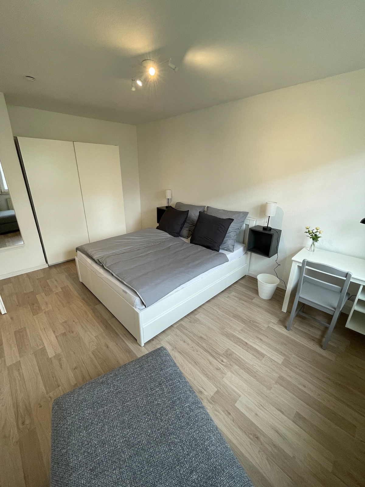 Das Zimmer mit integrierter Küchenecke und separatem Duschbad/Toilette hat einen eigenen Eingang und ist barrierefrei zu erreichen. Es befindet sich in einem Zweifamilienhaus. Die Küche ist mit einer Basic-Kocheinrichtung und Kühlschrank ausgestattet. Schrank, Kommode, ein Tisch und zwei Stühle, ein Doppelbett. W-LAN ist vorhanden.