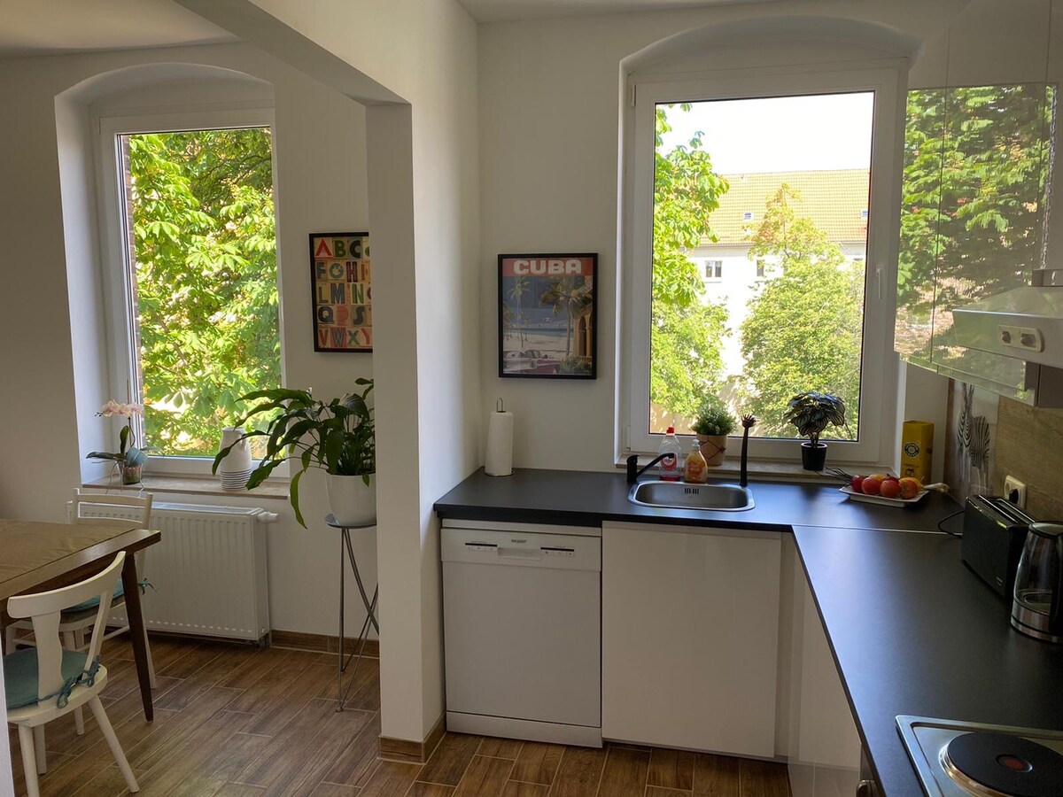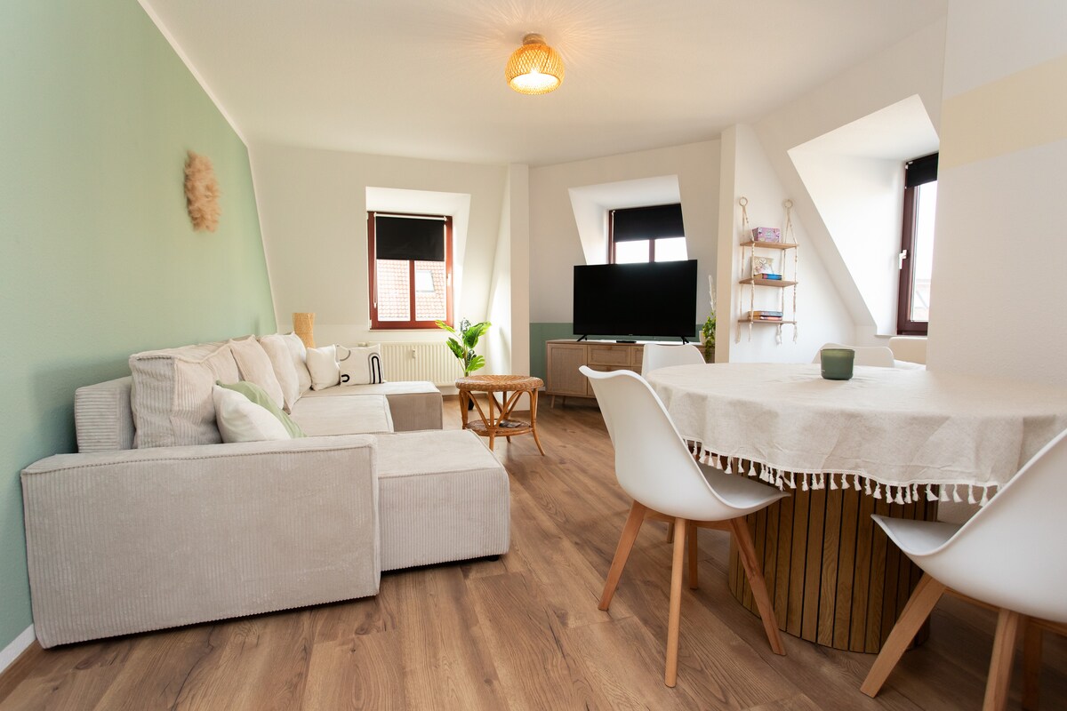 Welcome to Unesco World Heritage Quedlinburg, this charming non-smoking apartment is for rent in walking distance to the market, castle and the various conference facilities. The apartment on the ground floor was completely refurbished at the beginning of 2021 exclusively with organic materials, such as clay, real wood floor and wall paints on natural basis. In total, the living space is split into approx. 55 sqm with 2 rooms. 100 Mbit/s WLAN - mobile work ready