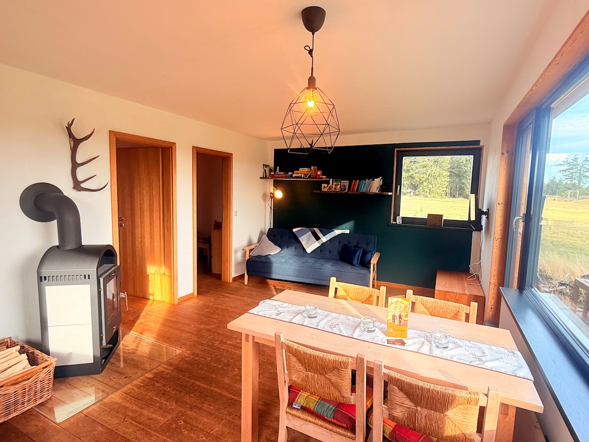 Apartment mit Wohn-/Schlafraum. 1 Doppelbett (1,80x2,00m) u. 1 Einzelbett (0,90x2,00m)auch 1 Kinderbett ist vorhanden. Voll ausgestattete separate gemütliche Wohnküche und Duschbad. Im Sommer sind Sitz+Liegemöglichkeiten im Garten. Im Winter ist die Loipe vor der Tür Private Sauna im Sommer mit Außendusche zu mieten (inkl. Handtücher,Bademantel und Aufguss von 10.00-18.00Uhr) Gerne könnt ihr im Sommer nach Voranmeldung Fahrräder mieten. Schlitten für Kinder geben wir euch gerne.