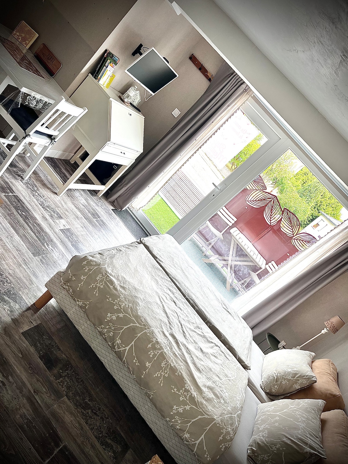 Jolie studio cocooning avec espace extérieur couvert en hiver sans vis à vis! Venez déposer vos valise pour un weekend en amoureux ou pendant un déplacement professionnel et pourquoi pas faire une pause sur la route de vos vacance ! A deux minutes à pied vous trouverez une pizzéria ou à 10 min a pied une brasserie. Vous pouvez profiter pendant votre séjour ou aprés votre journée de travaille de vous relaxer. L'appartement dispose d'une cuisine équipé, climatisation et d'un parking.