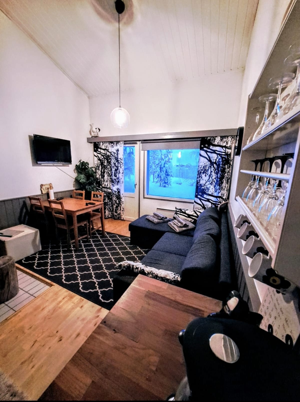 This holiday home is situated on the upper part of Kaunispää hill wherein the viewing tower for northern lights hunters is only 10-mins away by foot. This home has a living room, kitchen & two single beds which can easily be converted into a double bed. The kitchen is fully-functioning kitchen which is ideal for cooking meals. The bathroom is spacious w/ modern style sauna and hair dyer. Other feat: dishwasher, washing machine, separate dyer, iron & ironing board, WiFi+ smart TV, internet radio