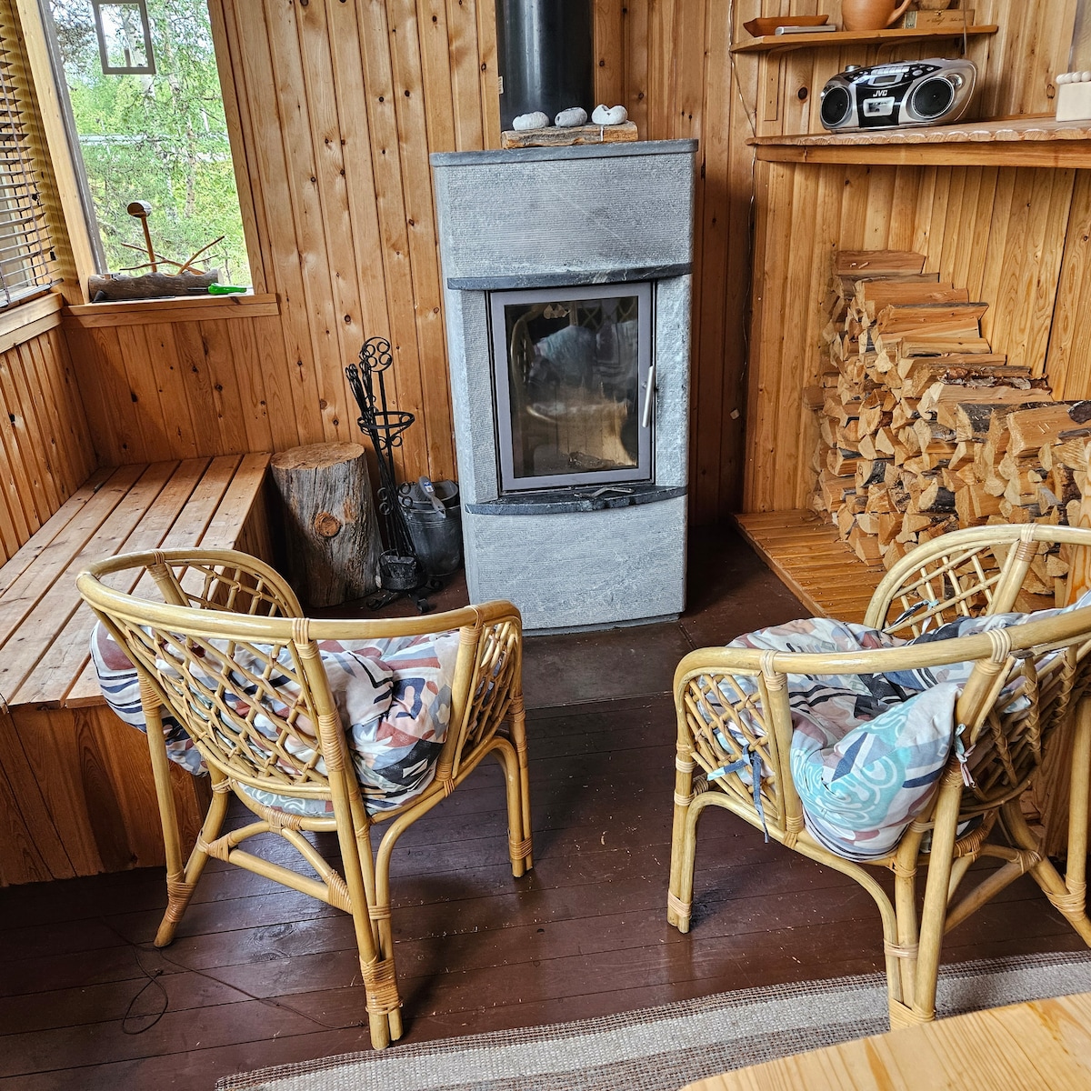 Fully equipped private house in a very quiet area, edge of the forest, near the center. Location with very little light pollution. Good place to see the northern lights. Two floors. Upstairs bedroom with double bed. The ground floor bedroom with two separate beds, living room, kitchen, toilet, bathroom, sauna and utility room. Balcony, terrace and fireplace. Centre of Ivalo 1 km Ivalo Airport 10 km Saariselkä 32 km Inari 37 km