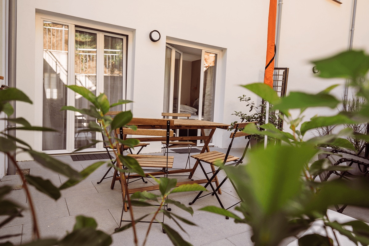The flat has a new kitchen, a bright bathroom (bathtub + shower), a cosy living room with a double sofa bed (140cm) and a large terrace with access to the courtyard. Next to it there is a study and a bedroom with a large bed (200cm) decorated with stucco work. The flat can be booked as a living-dining room combination with double sofa bed or as a spacious flat incl. study and bedroom (up to 6 people), see below.