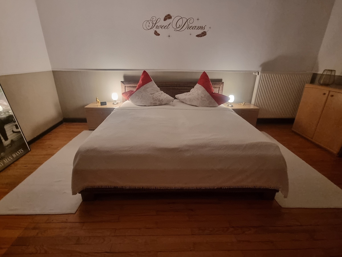 Lehne Dich zurück und entspanne Dich in dieser ruhigen und großen Wohnung. Auf 80 m²+ Balkon stehen Dir 2 Schlafzimmer mit einem Kingsize und einem Queensize Bett zur Verfügung: KEINE UNGEMÜTLICHE SCHLAFCOUCH ! Ein Esszimmer , ein Wohnzimmer , eine separate Küche und ein großes Bad mit begehbare Dusche sind auch vorhanden. Die Küche ist voll ausgestattet u.a. mit Senseo Kaffeemaschine und Kühlschrank/Gefrierfach. Ein Parkplatz fürs Auto und eine Garage für Motorräder sind auch vorhanden.