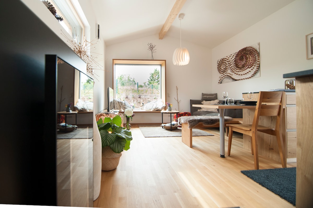RR ROOM – Ihre stilvolle Auszeit im Grünen. Moderne, helle und über 100 m² große Wohnung mit Terrasse und Blick ins Naturschutzgebiet. 2 Schlafzimmer, Kamin, voll ausgestattete Küche, Bad mit Wanne & Regendusche, Gäste-WC, Leseecke, Waschküche. Eigener Eingang & Parkplatz. Perfekt zum Abschalten & Wohlfühlen!