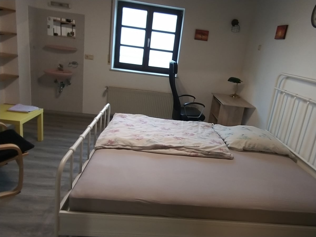 Das Zimmer im Herzen von Neunkirchen befindet sich in einer Tanzwerkstatt, inkl. Blick über die Stadt. Es ist liebevoll eingerichtet und verfügt über ein gemütliches 1,40 m Bett. Frühstücken in der Wohnküche kann man nach Absprache bis 11 Uhr.Es steht eine Küche, ein Bad und eine eigene Toilette zur Verfügung. Es empfiehlt sich von Freitag 20.00 - Montag 16.00 zu mieten, wenn man kein Interesse an Yoga, Tanz oder Gesang hat. Ferien sind auch toll. Die Location ist sehr schön.