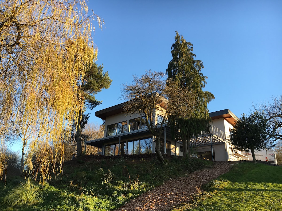 Willkommen in unserer außergewöhnlichen Wellness Ferienwohnung mit Sauna. ganz erhaben auf einem Berg genießen Sie atemberaubende Ausblicke über das Saartal bis über die Grenze nach Frankreich hinweg. - große Sauna im Außenbereich mit Panoramablick inklusive Bademäntel und Saunatücher - 8 Betten in (4 Schlafzimmern) - 2 Balkone - Smart TVs in jedem Schlafzimmer - Großer Garten mit Grillmöglichkeit und vielen gemütlichen Sitzgelegenheiten mit einzigartiger Fernsicht