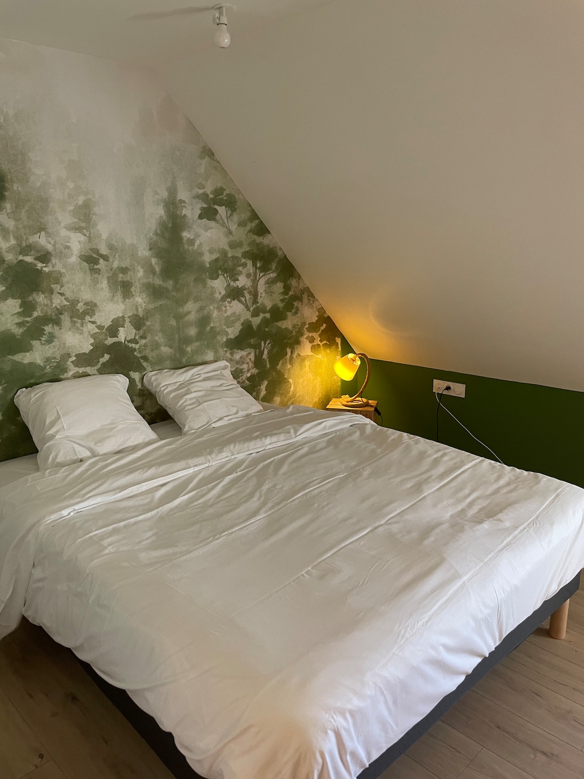 Grande chambre lumineuse à grand lit (160cm), elle vous raviva par son espace et son confort chaleureux. Salle d'eau avec douche, chauffage et rangement. Petit déjeuner express dans le minibar (inclus dans le tarif) et plateau de courtoisie avec bouilloire. Wifi, tv chaînes TNT + accès Netflix et Amazon, sèche-cheveux, linge de lit et de bain, gel douche, shampoing, parking gratuit devant la maison, accès local vélo/moto, accès au jardin. Arrivée autonome grâce aux serrures connectées.