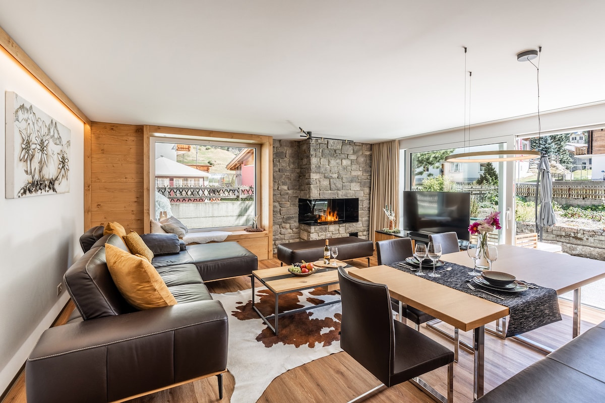 New: WMF Gourmet Station (raclette & fondue)! Welcome to the sunny, modern Alpine apartment in the heart of Saas-Grund! Saastalcard, pets, and cleaning included. No hidden costs! Inflatable hot tub & home cinema included! The stylish 2.5-room apartment has a fully equipped kitchen, high-quality furnishings, and everything you need is right on site: bus stop, bakery & waste disposal, ski & laundry room, parking & playground.