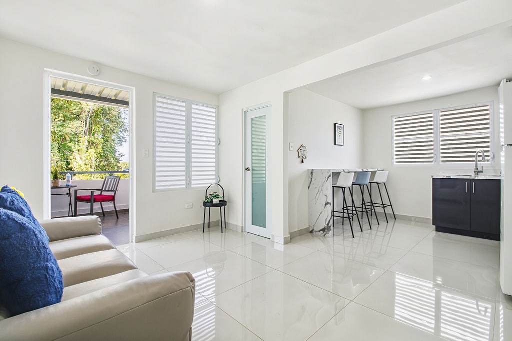 Casita Oliva, located on a Second Floor, has 2 bedrooms (FULL Beds), 2 bathrooms, 3 A/C units, Wi-Fi, 65-inch TV, Full Kitchen, Dining Room, Living Room, Laundry Room, Outdoor Terrace and a Workspace. The apartment is located: 11 mins to the SJU Airport 6 mins to The Mall Of San Juan 15 mins to La Placita de Santurce 17 mins to Ocean Park Beach 12 mins to Piñones Beach 20 mins to Old San Juan 19 mins to Distrito T-Mobile 14 mins to Coliseo Jose Miguel Agrelot 29 mins to El Yunque Rainforest
