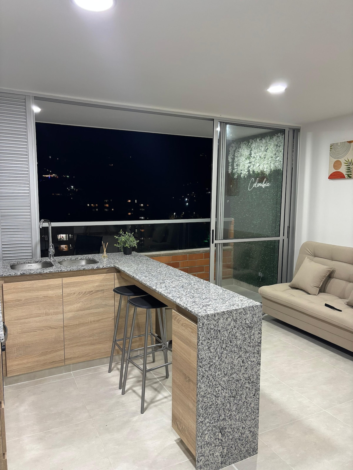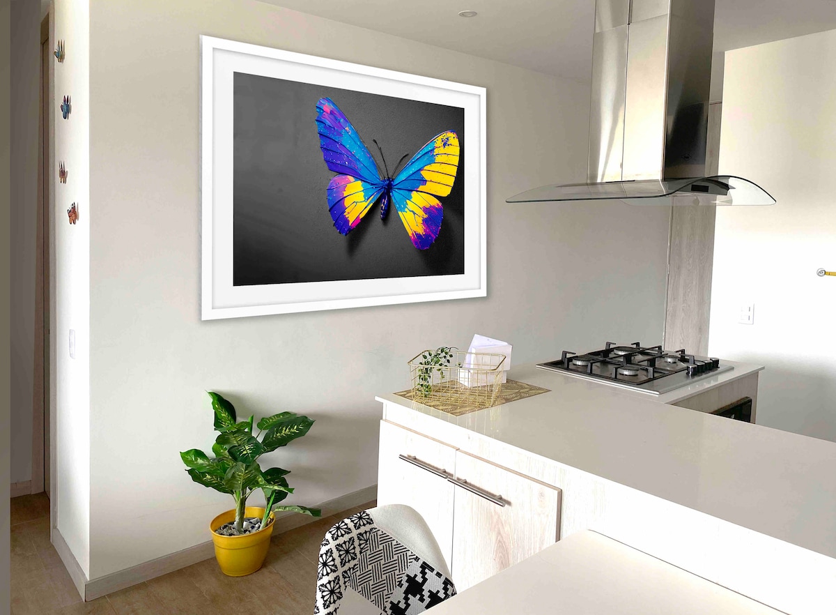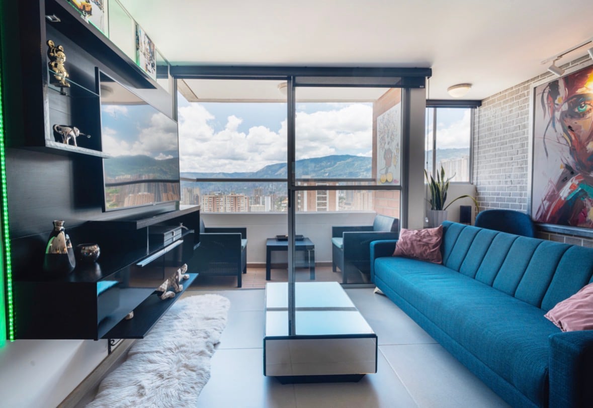Located in Sabaneta, this apartment is just a few minutes from the subway station, one of the main attractions of the city, being a clean, economical, safe and easily accessible means of transportation. Equipped with a pleasant workspace that allows you to see the city while you work. Your car will be safe in the private parking lot of a post. The kitchen and the living room are connected to make the unit a space to share a pleasant dinner with your group of friends.